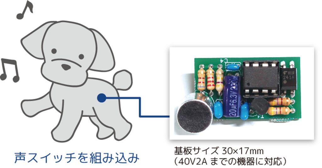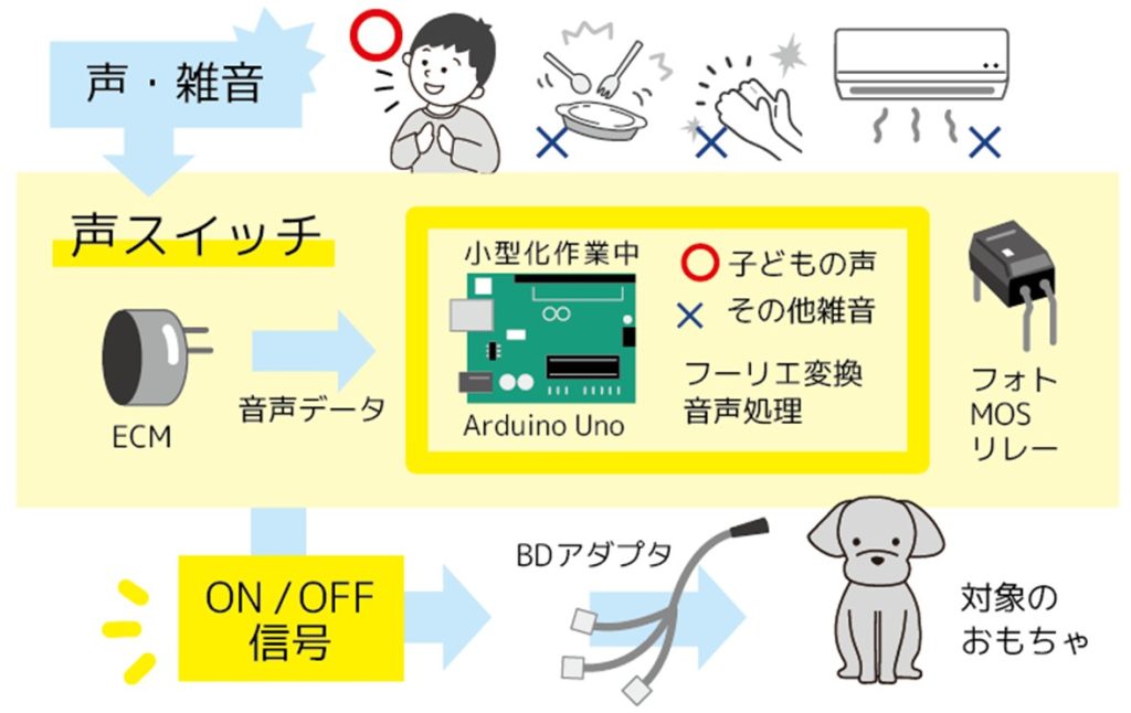 発声による意思表示のトレーニングを支援する「声スイッチ」です。興味ある対象を声でスイッチONするための制御基板です。マイコンで高速フーリエ変換することにより、子どもの声っぽい周波数の入力のみに反応します。例えば、絵本だとすぐ飽きてしまうとしても、興味がある対象ならトレーニングを続けられます。BDアダプタを介して任意の対象へスイッチを追加できます。